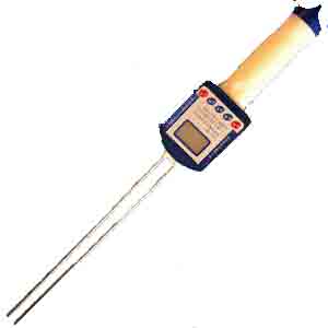 3、测量:把探杆插入粮食中,插到手柄根部,根据所测粮食品种,从表盘读出指针相应的指示值,加减温度校正值,即为所测粮食水分测量值。