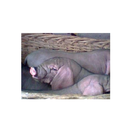 太湖母猪是世界上产仔数最多的猪种,享有“国宝”之誉,苏州地区是太湖猪的重点产区。太湖猪属于江海型猪种,产于江浙地区太湖流域,是我国猪种繁殖力强,产仔数多的著名地方品种。太湖猪体型中等,被毛稀疏,黑或青灰色,四肢、鼻均为白色,腹部紫红,头大额宽,额部和后驱皱褶深密,耳大下垂,形如烤烟叶。