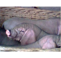 太湖母猪是世界上产仔数最多的猪种,享有“国宝”之誉,苏州地区是太湖猪的重点产区。太湖猪属于江海型猪种,产于江浙地区太湖流域,是我国猪种繁殖力强,产仔数多的著名地方品种。太湖猪体型中等,被毛稀疏,黑或青灰色,四肢、鼻均为白色,腹部紫红,头大额宽,额部和后驱皱褶深密,耳大下垂,形如烤烟叶。