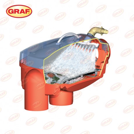 GRAF前置雨水过滤器(内置型)用于地埋式雨水罐和其他雨水井内。该前置雨水过滤器内置3层结构的不锈钢过滤系统,带有弃流功能,流量可达400L/S,过滤精度为0.35mm,进出水、收水接口直径为DN100。该前置雨水过滤器自带清洗功能,使用维护简单方便。
