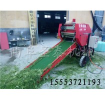 圣泰牌ST5552A型青贮打捆包膜一体机为青储专用设备,由打捆、包膜两部分组成,通过机器前部人工给固定仓喂料,当草捆大到固定仓和活动仓接触到一定密实度时,活动仓上方的惰性辊和左侧的信号轮会均匀转动,此时位于机器上方的信号灯会不停闪烁提醒操作者停止进料,操作者板动绕线离合手柄,机器开始往复饶绳捆扎,绕绳一周,麻绳自动切断,立即开仓放捆,草捆直接落入包膜机的旋转架上,用手把膜拉出,启动旋转按钮,旋转架带动草捆转动,操作者应同步迅速将膜压向草捆,并随着草捆旋转一周,然后立即松手,牧草膜逐渐逐层包裹在草捆外,草捆自随着旋转架公转,当包膜到设定的层数时,离合器自动脱开,旋转架停下,操作员在草捆和输膜架之间把牧草膜切断,把牧草膜断头一端压入草捆端面重叠处,用一人将包膜好的草捆搬入小推车内,推走摆放整齐。