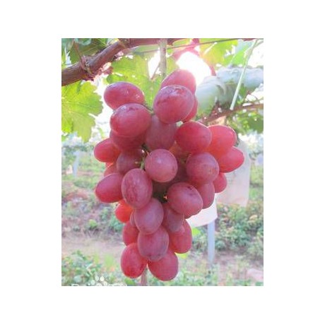 红巴拉多,欧亚种果穗大,平均单穗重600克,相当大单穗重2000克。果粒大小均匀,着生中等紧密,椭圆形亲本:巴拉蒂×京秀。品种特性:果穗大,平均单穗重600克,相当大单穗重2000克。果粒大小均匀,着生中等紧密,椭圆形,相当大粒重可达12克。果皮鲜红色,皮薄肉脆,可以连皮一起食用,含糖量高,相当高可达23%,无香味,口感优 秀。不易裂果,不掉粒。早果性、丰产性、抗病性均好。在张家港市7月上旬开始成熟,为极早熟品种。在避雨条件下,可以挂果到11月份。